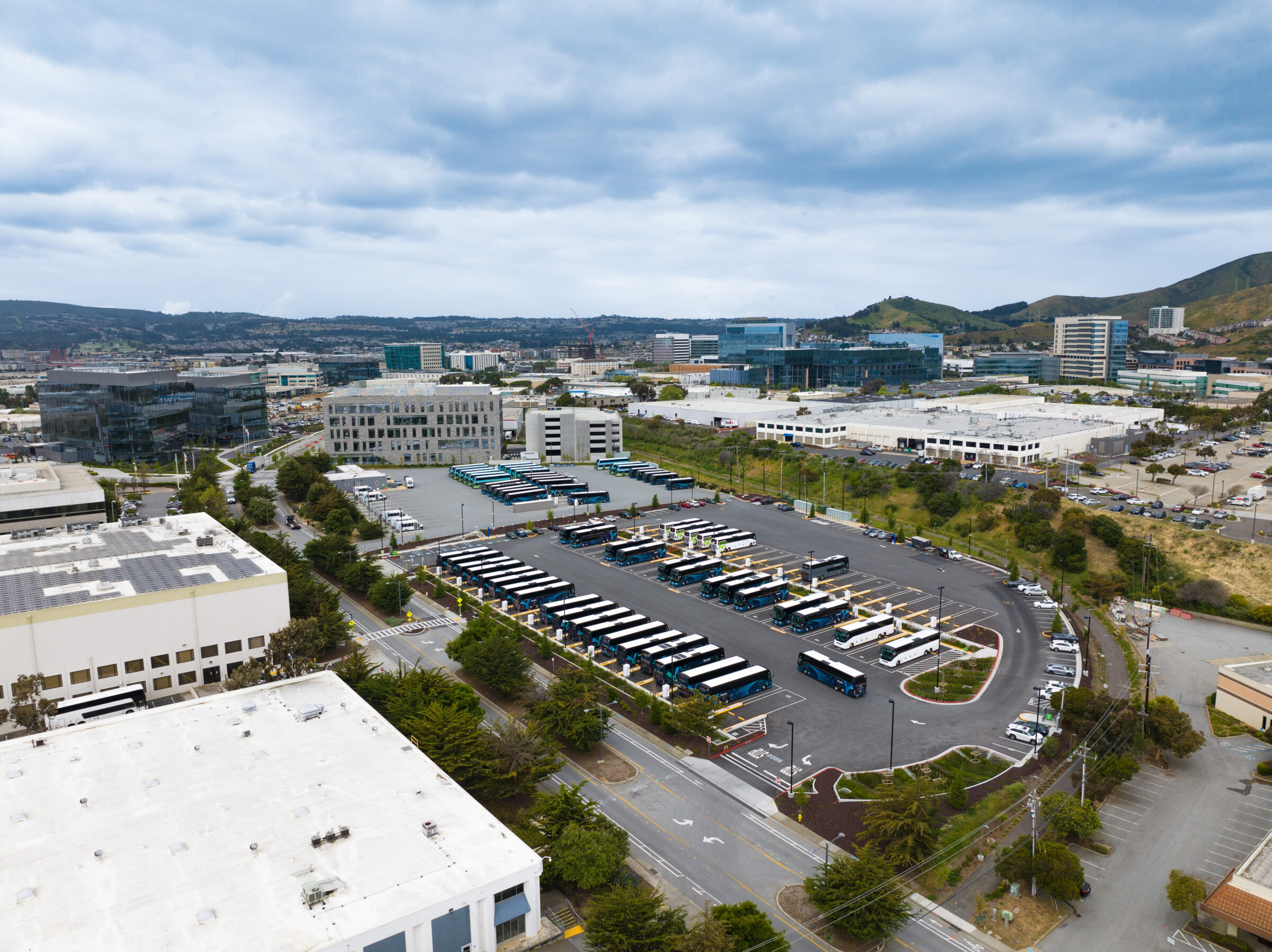 The Genentech B59 gRide lot is North America's largest electric bus charging depot, featuring EV chargers, new 4000A services, walkways, lighting, bioretention areas, and a monarch butterfly habitat.